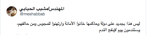 ” ليس هذا بجديد على دولة وحاكمها خانوا الأمانة وارتهنوا للمجوس ومن حالفهم، وستندمون يوم لا ينفع الندم”.