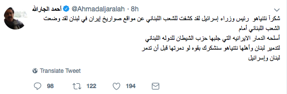 أحمد الجار الله كتب تغريدات تناشد نتنياهو بضرب إيران و حزب الله وربما فوق البيعة قطر، ويشكر نتنياهو على كلمته أمام الأمم المتحدة وكشفه لمواقع الصواريخ الإيرانية وناشده لضربها فورا، وأن يرسل فاتوة الضرب لسيده ابن سلمان ولا يهتم بالتكاليف.