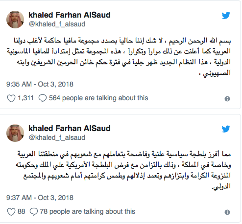 وأكد “آل سعود” على أن “ما حدث من جريمة اختطاف كاتب مرموق ذو شعبية عريضة في المملكة والخليج العربي وهو الأستاذ جمال خاشقجي ، من دولة تركيا وذلك بالتعدي الصريح الإستفزازي عليها والفتك بسيادتها ، لذا أخاطب كرامة دولة تركيا ، وأناشد ضمير الرئيس التركي رجب طيب اردوغان -الذي نقدره ونحترمه كثيرآ- ،أن يأخذ إجراءات حاسمة ورادعة ضد السلطات السعودية الحالية التي فقدت شرعيتها ورشدها واحترام شعبها لها ، لإسترجاع هذا الإنسان المسلم السعودي الذي طلب حمايتكم له علي ارضكم ، ولعدم تكرار هذا التعدي السافر للمعارضين السياسيين علي اراضيكم فيما بعد.”