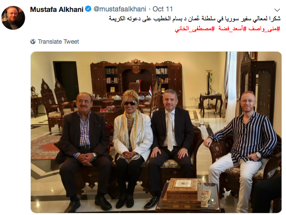 النمس نشر على حسابه على موقع تويتر عدة تغريدات منها تغريدة يشكر فيها سفير سوريا في سلطنة عمان بسام الخطيب الذي إستقبلهم في منزله في العاصمة العمانية.