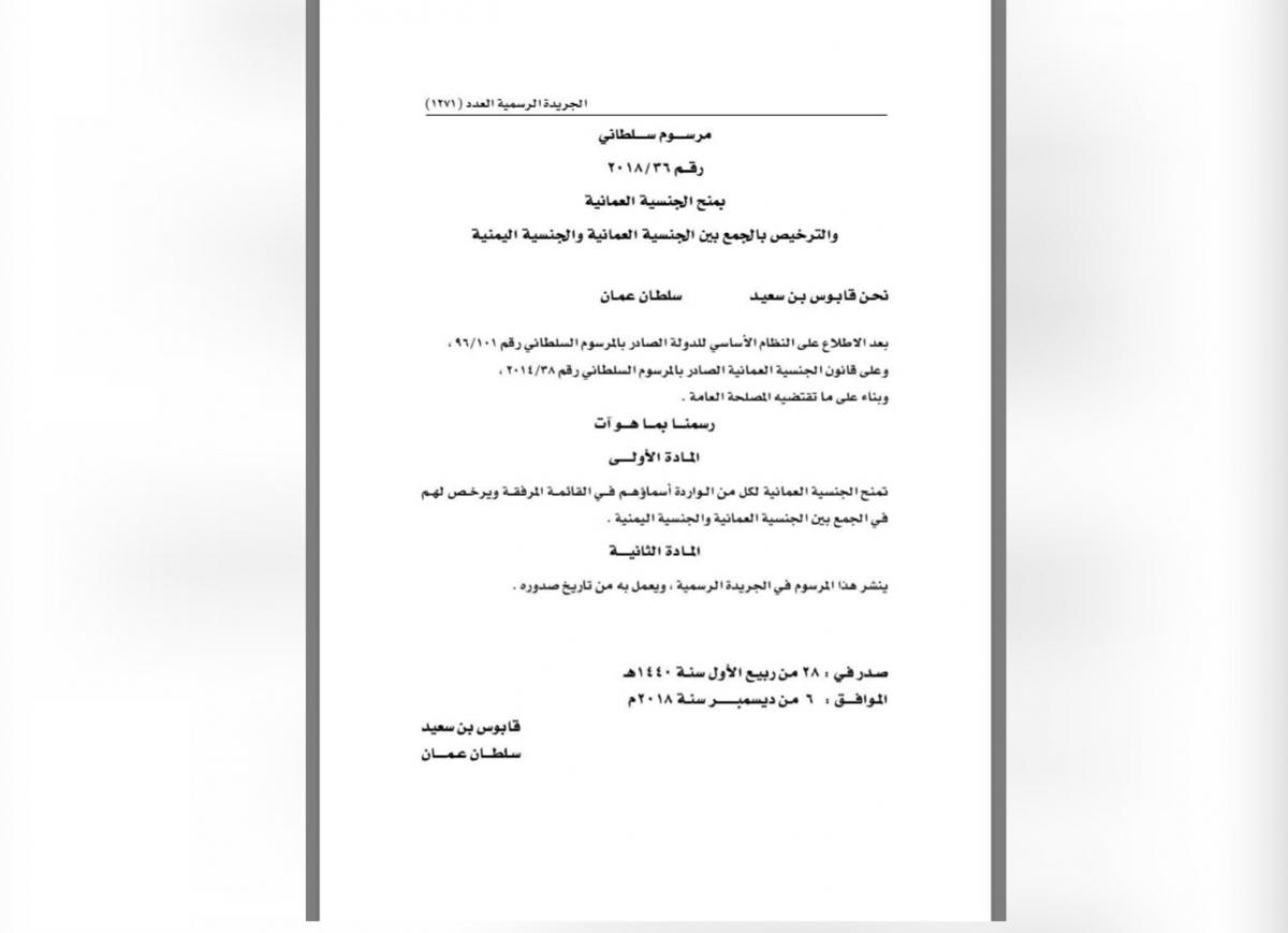 وقابلت مسقط التحركات السعودية الإماراتية بصدور مرسوم من سلطان عُمان قابوس بن سعيد، قضى بمنح الجنسية العُمانية لأسرتي سلطان المهرة الشيخ عيسى بن عفرار، ومستشار الرئيس اليمني ورئيس أول حكومة في دولة الوحدة اليمنية حيدر أبوبكر العطاس، بالإضافة لمنحه الجنسية لـ69 شخصاً من أبناء الأسرتين.