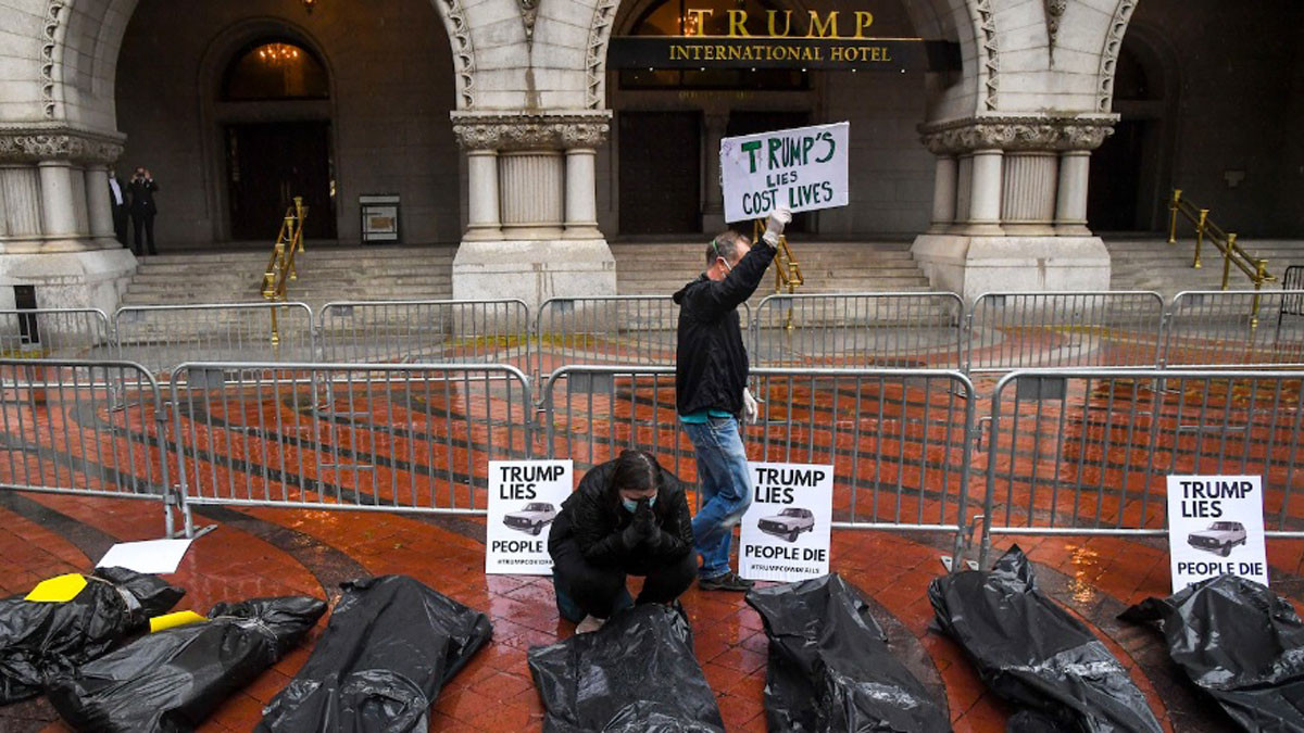 احتج عدد من مواطني الولايات المتحدة الأمريكية، على تعامل الرئيس دونالد ترامب مع أزمة فيروس كورونا المستجد، عبر وضع “أكياس الجثث” خارج فندق تملكه عائلته. وملأ المحتجون أكياس القمامة السوداء، بالكرتون والصحف، لكي تبدو وكأنها أكياس جثث ضحايا الفيروس “الفتاك”، قبل وضعها خارج فندق ترامب الدولي في العاصمة واشنطن.