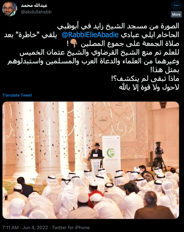 ونشر الناشط عبد الله محمد الصورة وعلق عليها كما لسع الدبور ما نصه: “الصورة من مسجد الشيخ زايد في أبوظبي الحاخام ايلي عبادي يلقي “خاطرة” بعد صلاة الجمعة على جموع المصلين ! للعلم تم منع الشيخ القرضاوي والشيخ عثمان الخميس وغيرهما من العلماء والدعاة العرب والمسلمين واستبدلوهم بمثل هذا! ماذا تبقى لم ينكشف؟! لاحول ولا قوة إلا بالله”