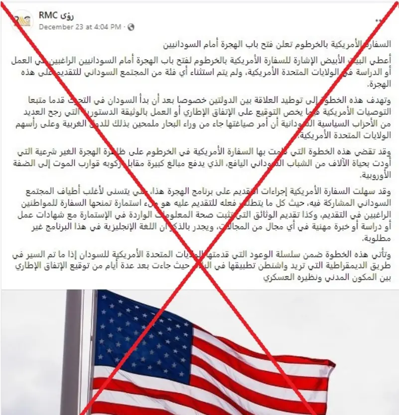 فقد تداولت صفحات وحسابات على مواقع التواصل الاجتماعي في السودان. منشورات تدّعي أن السلطات الأميركية أعلنت فتح باب الهجرة أمام السودانيين للعمل أو للدراسة، ما دفع السفارة الأميركية في الخرطوم لنفي ذلك.