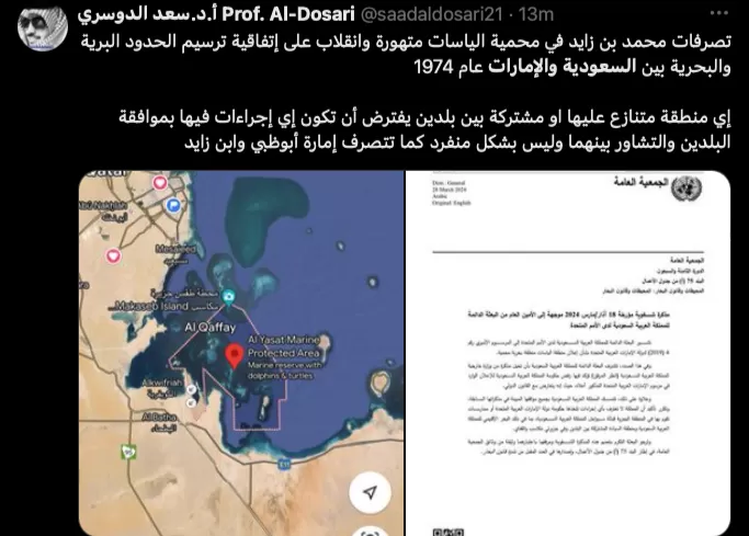 فقد كشف خطاب موجه للأمم المتحدة عن شكوى سعودية ضد الإمارات، تتهم أبوظبي بالتعدي على حدود المملكة عبر إعلان السلطات الإماراتية لمنطقة الياسات “منطقة بحرية محمية”.