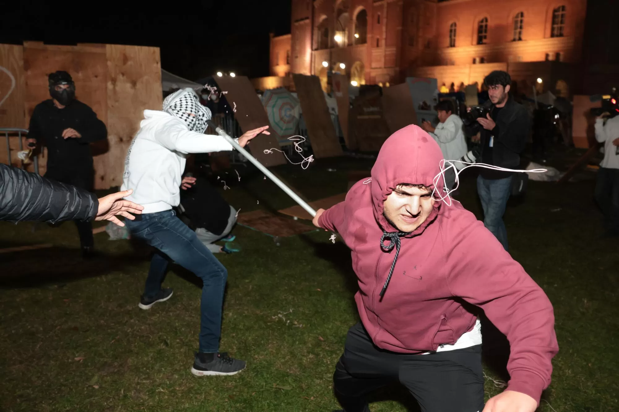 واقتحم المهاجمون الملثمون، الذين وصفهم مسؤولو الجامعة والشرطة بأنهم “محرضون”. موقع الاحتجاج بالهراوات والعصي، مما أدى إلى مناوشات ضارية تبادل فيها الجانبان الضربات ورش كل منهما الآخر برذاذ الفلفل.