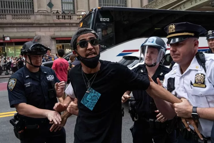 فقد اعتقلت شرطة مدينة نيويورك العديد من المحتجين المتضامنين مع فلسطين في مظاهرة أسفرت عن إغلاق القاعة الرئيسية الشهيرة في محطة “غراند سنترال” أمام المسافرين في ساعة الذروة مساء يوم الخميس.