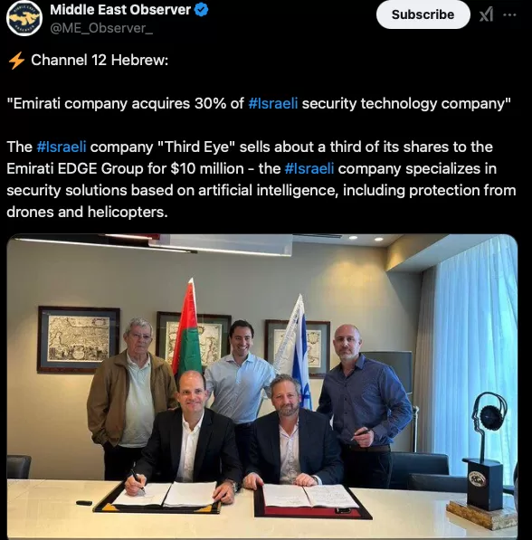 الوطن – قالت شركة ثيرد آي سيستمز، وهي شركة إسرائيلية لتوريد العتاد العسكري، إنها باعت 30 بالمئة من أسهمها لشركة إيدج الدفاعية المملوكة لدولة الإمارات مقابل 10 ملايين دولار، في استثمار علني نادر من شركة إماراتية في إسرائيل منذ بدء حرب غزة قبل 15 شهرا.